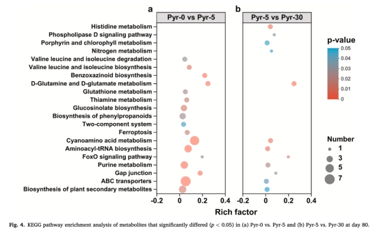 測量顯示高芘組(Pyr-30)pH下降滯后(圖1b),表明微生物有機質礦化活性受抑制,與TOC降解率降低(圖1c)和代謝組學中碳通路上調減弱(圖4a)相互驗證。