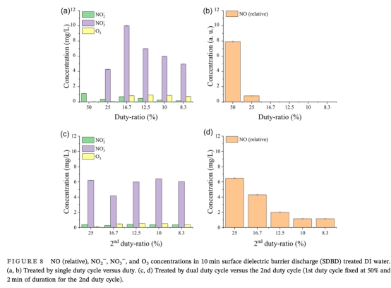溫度數(shù)據(jù):SDBD表面溫度隨占空比線性升高(6°C/10%占空比,圖4b)。意義:量化溫度控制精度,關(guān)聯(lián)物種生成閾值(O?: <100°C, NO: >170°C)。來源圖4。