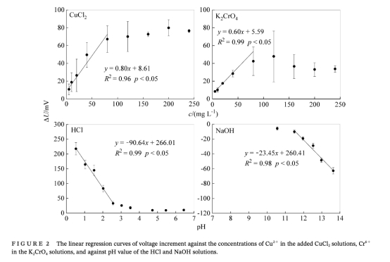 電壓響應數據:記錄添加污染物后的實時電壓變化(圖1)。意義:量化不同污染物的信號特征(峰/谷/無響應),確定檢測限(Cu2?/Cr??: 5 mg/L;HCl: pH 3.51;NaOH: pH 11.50)和線性范圍(圖2)。來源圖1、圖2。