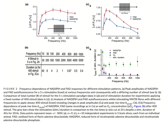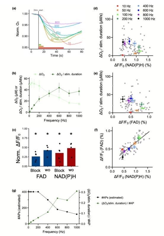 對比數據:>100 Hz時NAD(P)H/FAD峰值飽和而氧消耗率持續增加(圖3d-e)。