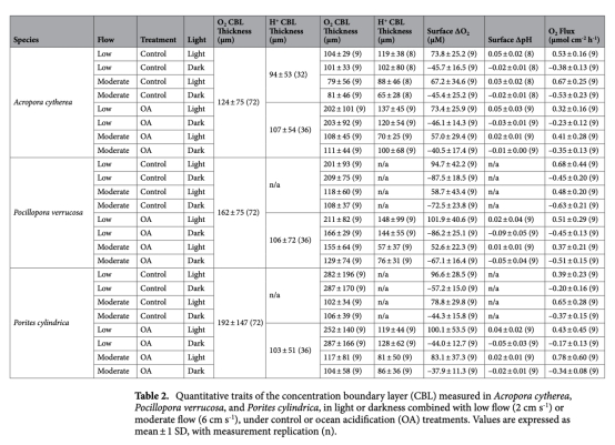 數(shù)據(jù):低流速下增厚61-159%(物種差異顯著),OA僅使A. cytherea在低流速下增厚。