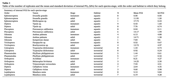 測量15種昆蟲(涵蓋9目)幼體和成體的組織氧分壓(PO?),發現顯著差異(0–18.8 kPa)。