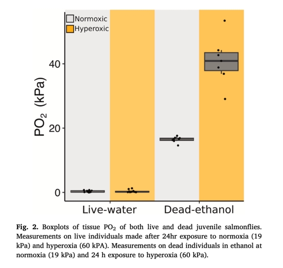 活體石蠅幼體在高氧水(60 kPa)中PO?維持0.04 kPa(無變化),死亡個體PO?隨環境氧升高(19 kPa→32 kPa)。
