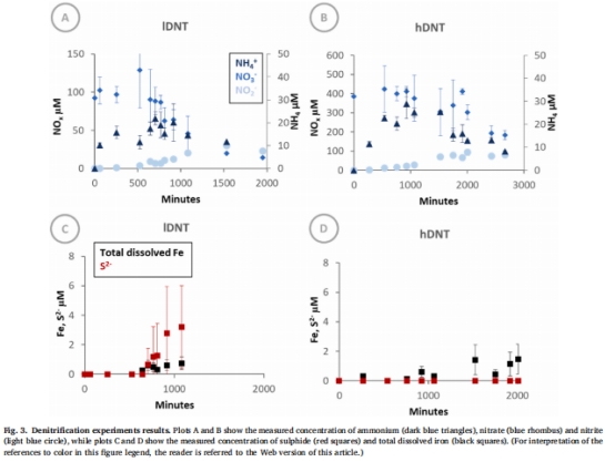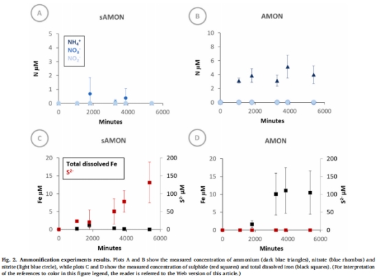 數據:∑S2?在表層沉積物實驗(sAMON)中積累(130 μM),深層(AMON)無積累(圖2C,D);Fe2?在反硝化/CDNT實驗中釋放(圖3C,D, 圖4C,D)。
