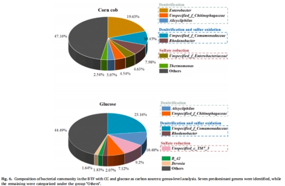 碳源對(duì)比:CC0.03與葡萄糖的NOx/SO?去除效率相當(dāng),但CC系統(tǒng)更易積累NH??和SO?2?,葡萄糖系統(tǒng)S?產(chǎn)量更高(圖5),源于碳源性質(zhì)驅(qū)動(dòng)的菌群分化(圖6)。