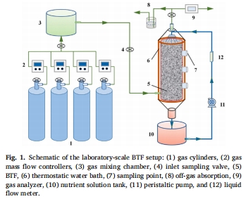 構(gòu)建實(shí)驗(yàn)室規(guī)模BTF(圖1),以CC0.03為碳源,分三階段提升入口NOx濃度(300→700→1000 mg/m3)。