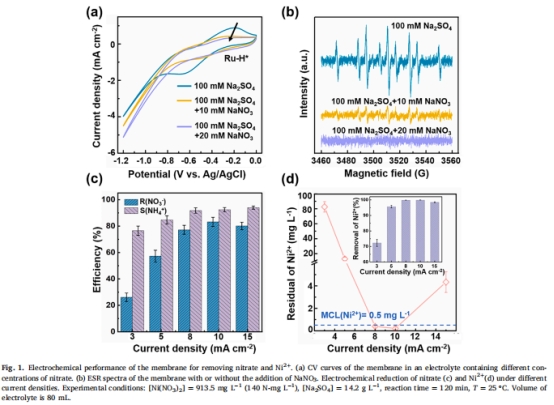 意義:證實Ru催化層通過H*介導間接電子轉移(IET)還原硝酸鹽(選擇性94%),電流密度10 mA/cm2時Ni2?殘留<0.5 mg/L。