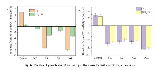 P和N通量數據(來自Fig. 6)。研究意義:計算沉積物向上覆水的營養鹽通量(如LOZ組TP通量變為-8.06 mg/m2/d),顯示LOZ逆轉釋放通量為負值,證明材料有效阻斷了內部營養鹽負荷,支持吸附和氧補充的協同作用(Fig. 6a-b顯示通量顯著降低)。