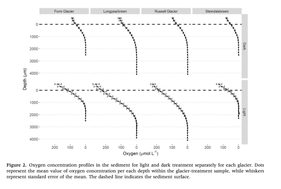 光照下所有樣品均出現厭氧區,深度因冰川來源而異(北極冰川3100μm vs. 阿爾卑斯冰川1500μm);
