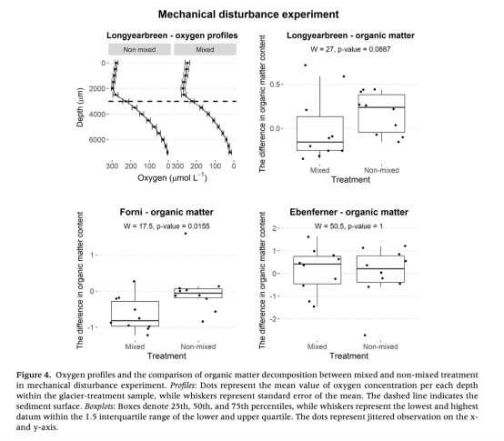 機械混合對有機質分解的影響因地而異(Forni冰川顯著降低,Longyearbreen趨勢類似但不顯著,Ebenferner無差異)。