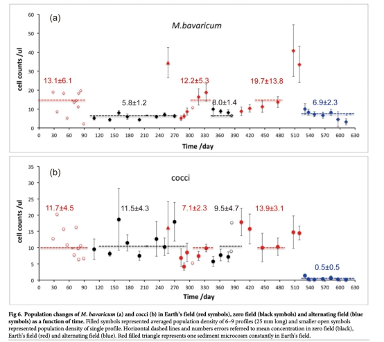 4.2 球菌在交變場(chǎng)中幾乎滅絕,符合極性趨磁機(jī)制(依賴固定磁場(chǎng)方向);而M. bavaricum在交變場(chǎng)中僅中度下降且分布改變,暗示其可能具備極性切換或代謝適應(yīng)能力。