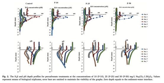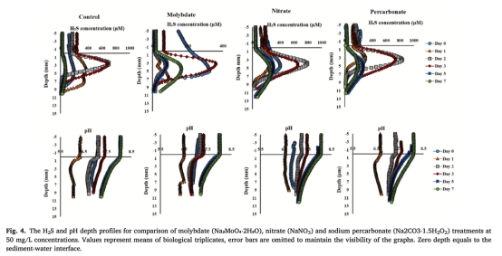 研究意義:量化H2S生產時空動態,顯示鉬酸鹽處理顯著降低水柱和沉積物H2S濃度(如M-50處理在沉積物-水界面減少73%),而硝酸鹽和過碳酸鈉僅臨時減少水柱H2S;這些數據直接驗證鉬酸鹽的抑制機制優于其他處理。