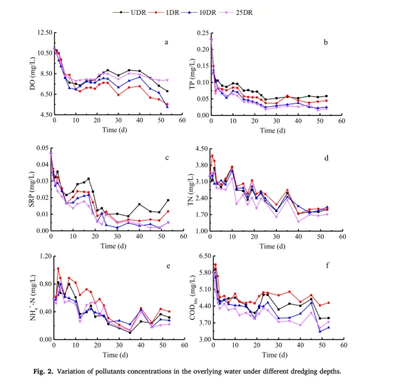 數(shù)據(jù)內(nèi)容:不同疏浚深度下上覆水TP、SRP、TN、NH??-N、CODMn濃度變化。