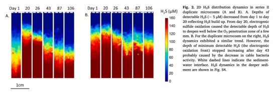 測量數據:電纜細菌豐度垂直分布(AO染色/FISH技術)(來自圖1,3)。研究意義:量化菌絲密度(最高2840 m/cm2)及時空動態(初期富集亞表層0.25-1.5cm,后期向表底層擴散),關聯代謝活性變化。
