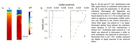 探討了電纜細菌在缺乏鐵(Fe)和錳(Mn)的碳酸鹽沉積物(美國佛羅里達灣)中的活動及其對元素循環的影響。通過實驗室微宇宙實驗,結合高分辨率傳感技術(如平面光學傳感器和微電極),研究發現電纜細菌可利用深層溶解態硫化物(H?S)作為還原劑,無需依賴固態硫化物或鐵錳循環即可維持電硫氧化(e-SOx)代謝。電硫氧化導致沉積物表層(陰極區)pH升高(~8.5)促進文石和高鎂方解石沉淀(Ω=2-3),而亞表層(陽極區)pH降低(~6.5)引發碳酸鹽溶解(Ω=0.2-0.3),伴隨Ca2?、Mg2?釋放。磷酸鹽(ΣPO?3?)在電活性區被消耗,可能與電纜細菌細胞內聚磷酸鹽積累有關,這對磷受限的碳酸鹽沉積物中海草磷獲取有潛在意義。
