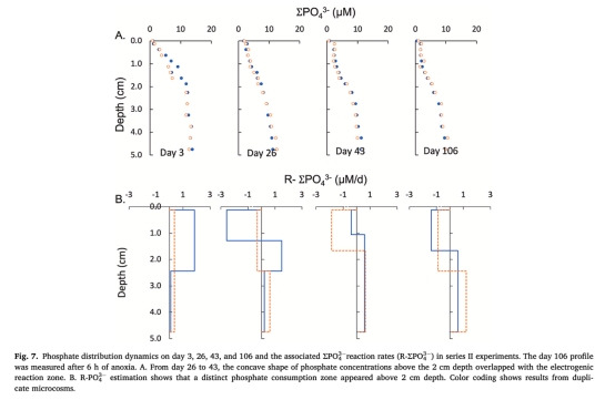 磷循環受電纜細菌活動調控:電活性區(0-2cm)ΣPO?3?凈消耗(R-ΣPO?3?=-0.5~-2.5μM/d,圖7B),可能因細胞內聚磷酸鹽積累(估算消耗孔隙水磷50-900μM)及碳酸鹽吸附;這對海草磷獲取有潛在意義。