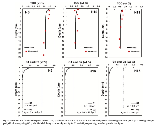 測(cè)量數(shù)據(jù):固相TOC含量及反應(yīng)性Fe(III)/Mn(IV)氧化物(來自圖3和圖5)。研究意義:TOC垂直分布(H5:1.55 wt% → H16/H18:0.68–0.72 wt%)反映OC礦化程度;Fe(III)/Mn(IV)含量(0.10–0.21 wt%)約束鐵/錳還原路徑的電子受體供應(yīng),支持模型對(duì)金屬還原速率的量化。