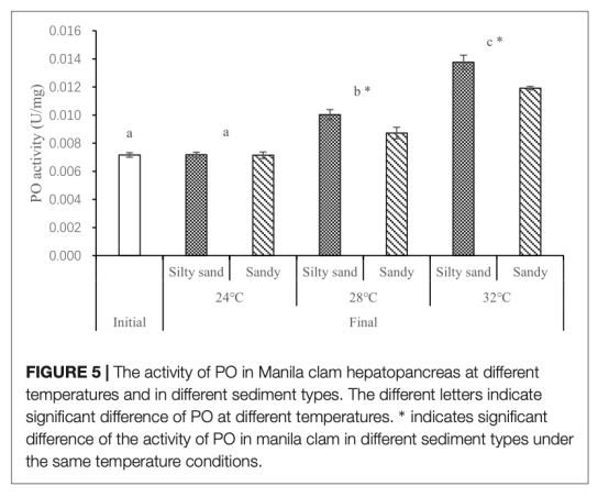 溫度升高導致沉積物溶解氧消耗加快和硫化氫釋放增加,沉積物類型(粉砂質沙比沙質更嚴重)顯著影響這一過程;菲律賓蛤仔在低氧環境下通過減少埋藏深度來行為適應,但生理上未進入厭氧代謝;然而,硫化氫積累可能激活酚氧化酶活性并損害免疫系統,長期暴露會增加死亡率風險。因此,夏季高溫時需監控沉積物環境,并優先選擇沙質沉積區進行養殖以防止鏈式反應造成的危害。
