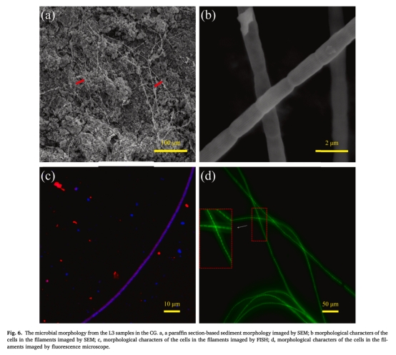 SEM顯示電纜細(xì)菌表面吸附大量顆粒(圖6a,b);FISH和熒光顯微驗(yàn)證其活性及串珠結(jié)構(gòu)(圖6c,d)。