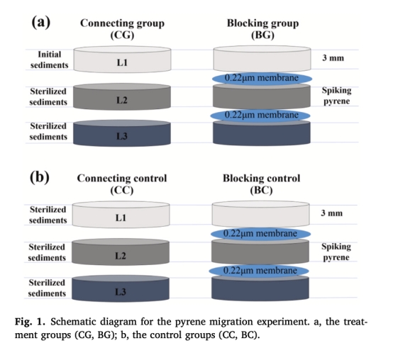 研究首次通過實(shí)驗(yàn)證實(shí)微生物載體(特別是電纜細(xì)菌)能顯著促進(jìn)沉積物中多環(huán)芳烴(PAHs)的遷移。以芘(pyrene)為模式污染物,設(shè)計(jì)"連接組"(CG,允許微生物遷移)和"阻斷組"(BG,限制微生物遷移)的沉積物微宇宙實(shí)驗(yàn)。結(jié)果表明:
