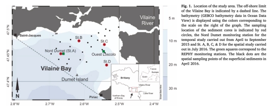 研究通過現場觀測、實驗室測量和反應輸運模型(RTM),探究了法國富營養化溫帶大型潮汐海灣——Vilaine灣(VB)底棲氮(N)循環的時空變化?;?015年單站時間序列(6次)和2016年多站空間調查的數據分析表明: