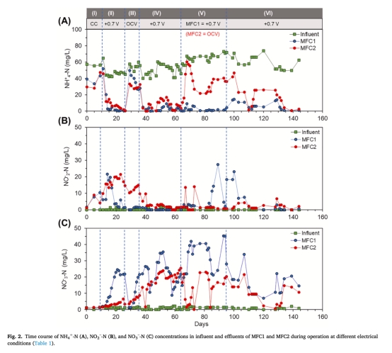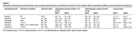 氮去除率數據:驗證固定陰極電位使NH??-N去除率提升3倍(vs. OCV),為MFC工藝優化提供關鍵參數(表1)。