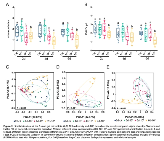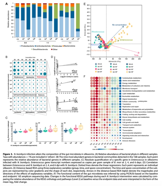 意義:量化Nb感染的劑量/時間依賴性及對家蠶生長的抑制,為后續菌群分析提供感染模型基礎。