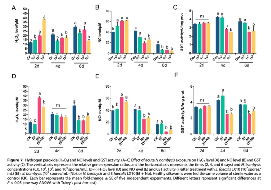 數據:免疫基因(Akirin, Cecropin A, Mesh, Ssk, DUOX, NOS)表達量(RT-qPCR)(圖6)、H?O?/NO水平、GST活性(圖7)。