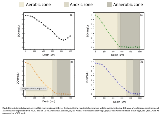 通過DO梯度曲線(圖4)直接量化顆粒內部氧擴散深度(如R1:600μm),明確低劑量PAC(50 mg/L)形成最大厭氧區(qū)(DO<0.2 mg/L區(qū)域占比最高),為高反硝化速率(20.55 mgN/g-MLSS·h)提供空間證據。