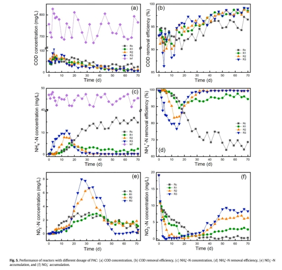 意義:驗證PAC提升脫氮效率(R3的NH??-N去除率99.38%),但高劑量導致NO??積累(9.34 mg/L)(第3.3節(jié))。