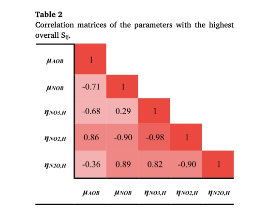 初步校準(10參數)→ 靈敏度分析(圖4)→ 相關性矩陣(表2)→ 最終校準(4個關鍵參數:ηN2O,H、ηNO2,H、μAOB、μNOB)