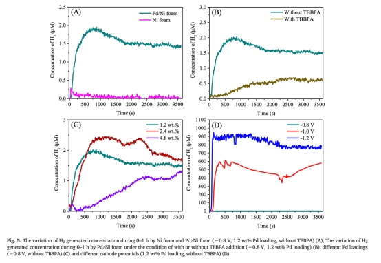 ? 數(shù)據(jù):-0.8 V時(shí)Pd/Ni foam的H?濃度(1.5 μM)為Ni foam(0.1 μM)的15倍;添加TBBPA后H?濃度下降0.6 μM