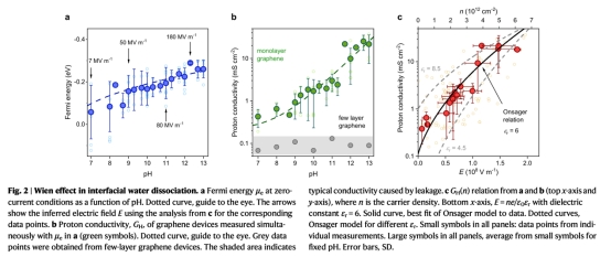 1. 強電場(>10? V/m)在石墨烯-水界面顯著加速水解離,質子電流隨電場指數增長,定量符合昂薩格理論(ε?≈6)