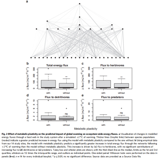 數據來源:基于14條溪流食物網數據,對比"有/無代謝可塑性"模型在+2℃下的能量通量變化。
