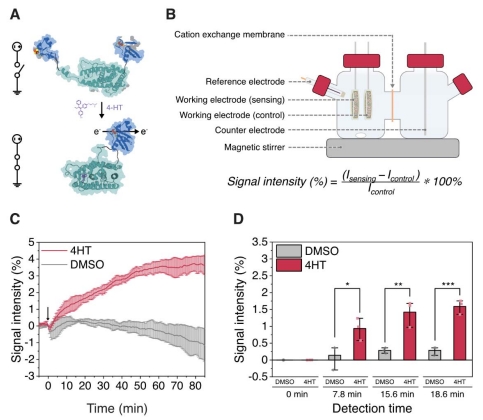 將雌激素受體配體結(jié)合域整合至鐵氧還蛋白(Fd),構(gòu)建4-HT門(mén)控電子開(kāi)關(guān)(圖3A)