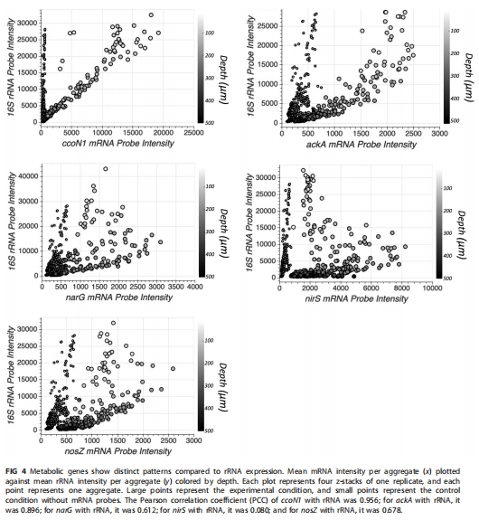 50-150μm(缺氧區):narG峰值(聚集體內部),nirS擴散至整個聚集體;