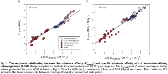 高親和力組(Km(app)≤0.025 μM):Nitrosopumilales(如海洋菌N. maritimus);