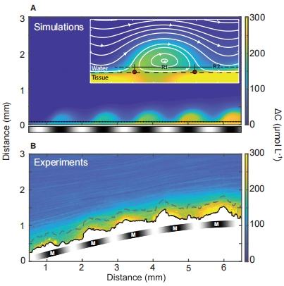 纖毛渦流作用:形成尺度500μm的渦旋(圖2B),將共肉產生的氧氣橫向輸送至口部區域(圖3)