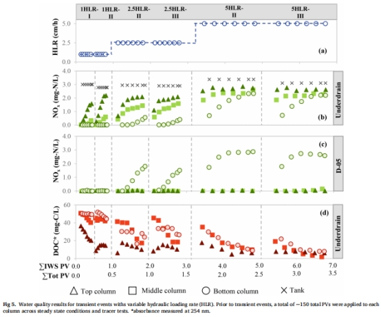 DOC輸出:底部排水口DOC通量3560 mg-C/m2 > 頂部1980 mg-C/m2(HLR=5 cm/h)