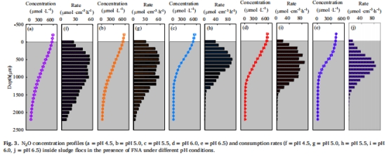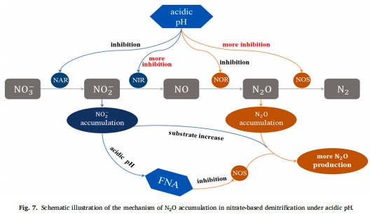 抑制機(jī)制:微電極分析表明,H?(氫離子)是N?O還原酶(NOS)的真實(shí)抑制劑,而非游離亞硝酸(FNA);同時(shí)低pH促進(jìn)NOR活性,增加N?O生成。
