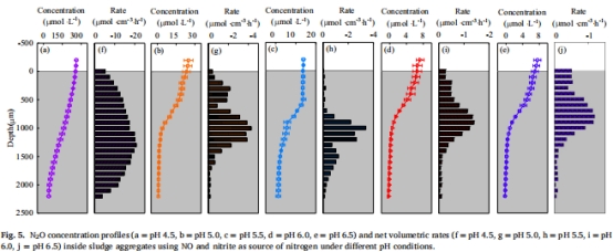 有FNA時(shí)N?O生成速率 圖5f–j FNA存在進(jìn)一步刺激生成速率(pH4.5時(shí)比無(wú)FNA高8.4%),增加底物效應(yīng)。