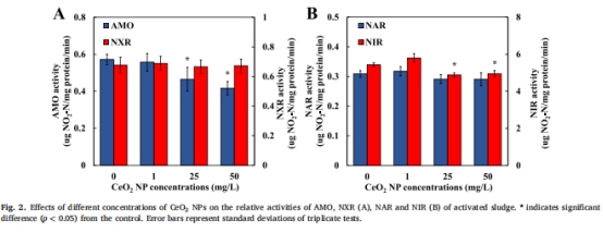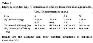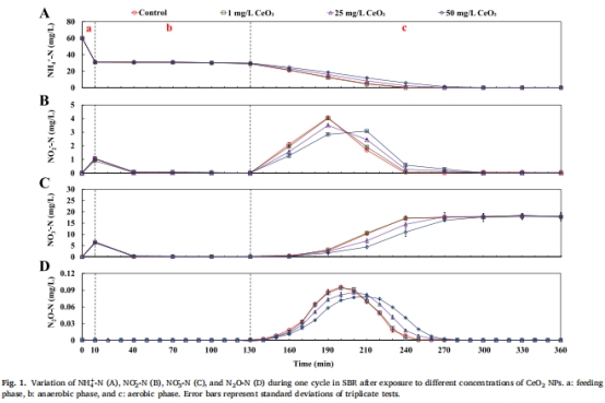 反應器性能:在SBR中測試不同濃度CeO? NPs(0、1、25、50 mg/L)對氮轉化及N?O排放的動態影響(圖1)。