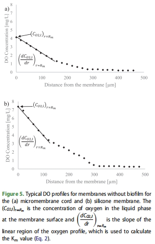 傳質差異:硅膠膜的氧氣傳質系數(Km)為2.6 m/d,微膜束的表觀Km為1 m/d(圖5)。