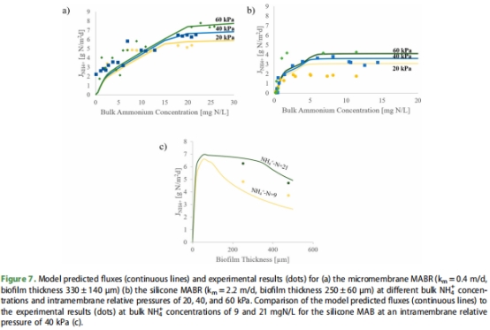 模型指導設計:MABR模型可準確預測通量(圖7),支持膜類型與操作參數優化。