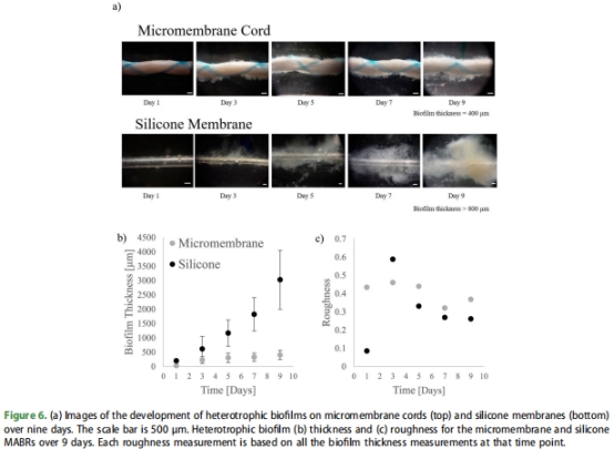 本文對比了兩種商用MABR膜(硅膠中空纖維膜與SUEZ的微膜束)對硝化生物膜行為的影響: