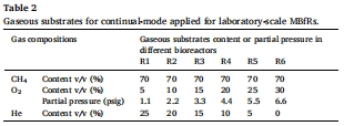 構建6組MBfR,施加梯度氧分壓(1.1–6.6 psig),通入CH?/O?/He混合氣(表2)。