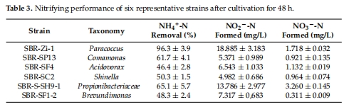 分離菌株SBR-Zi-1(Paracoccus)氨氮去除率96.3%,亞硝酸鹽產量18.9 mg/L(表3)。