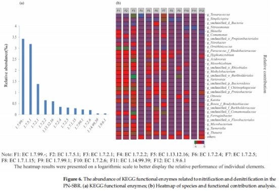 氨氧化基因(amo, hao)豐度低(0.053‰-0.22‰),反硝化基因(nirK, nar等)豐度高(0.12‰-3.23‰)(圖6a)。