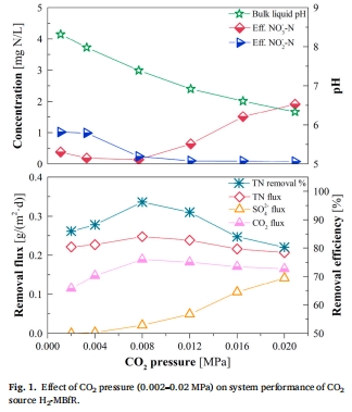 論文探討了 CO?壓力(0.002–0.016 MPa) 對氫氣膜生物膜反應器(H?-MBfR)脫氮性能的調控機制。核心發現包括: