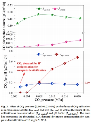 短期實驗(階段2):測試不同CO?壓力(0.002–0.02 MPa)對脫氮效率、pH、中間產物(NO??)的影響(圖1)。